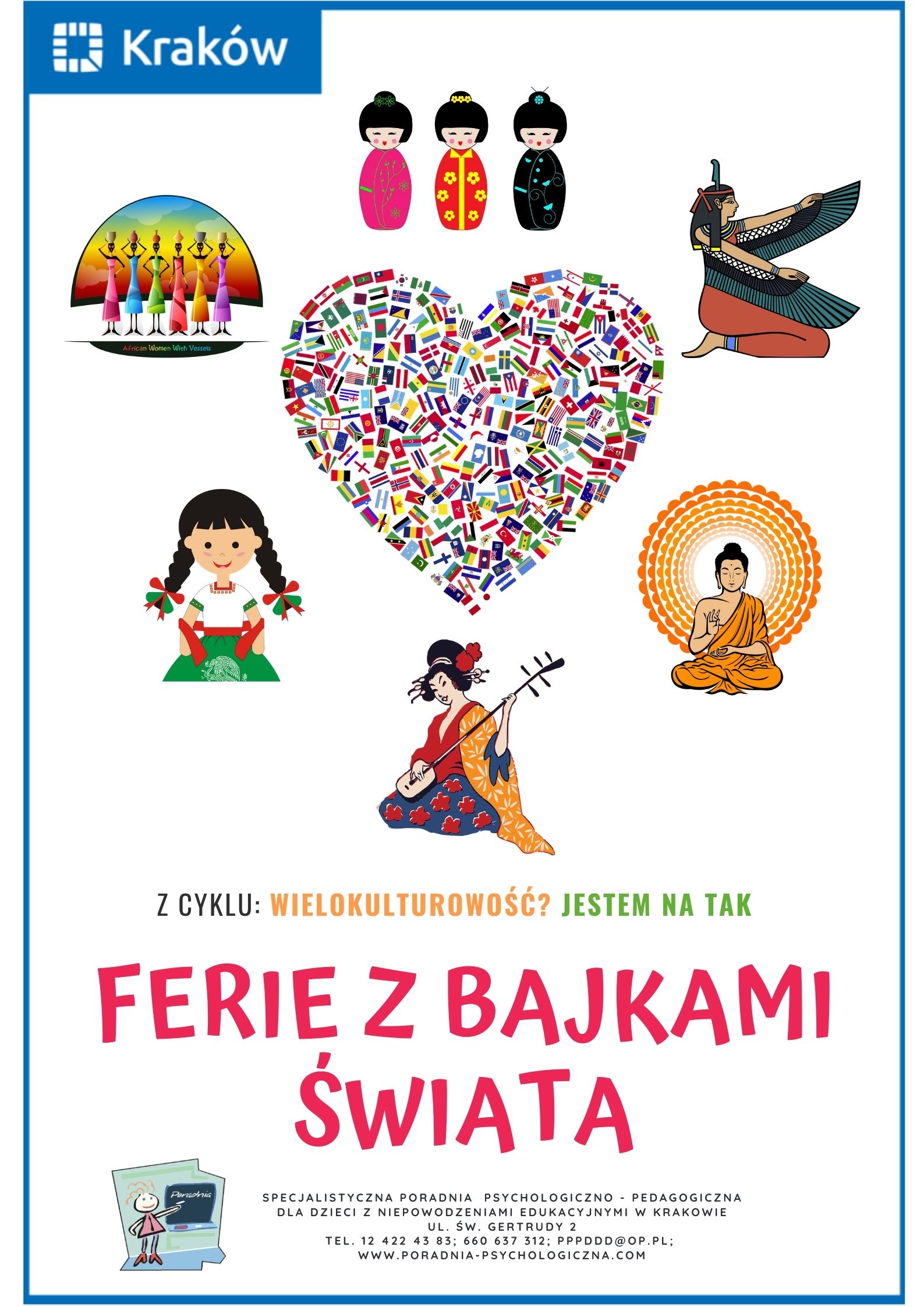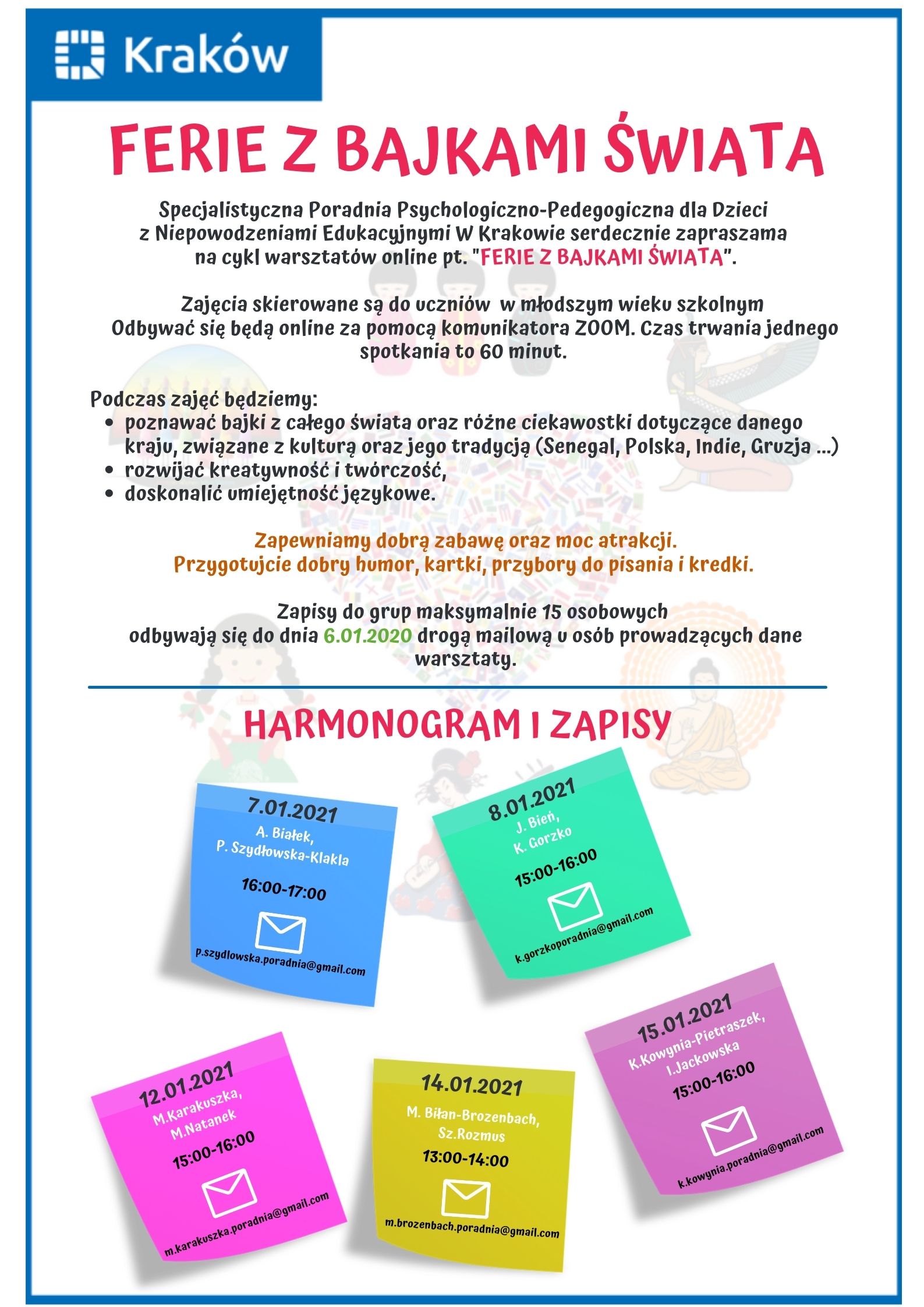 Cykl warsztatów online pt. ''Ferie z bajkami świata'' przygotowany przez Specjalistyczną Poradnię Psychologiczno-Pedagogiczną dla Dzieci z Niepowodzeniami Edukacyjnymi w Krakowie - plakat oraz harmonogram/zapisy.
